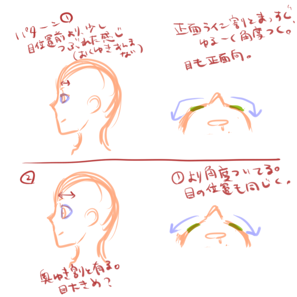 実際の人物やリアル系モデルに多いのが①かなあと…目の位置は割と前。