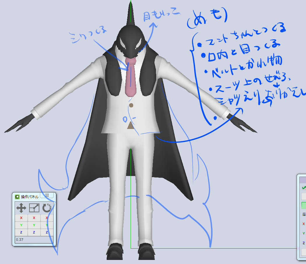 MMDに持っていって試しに動かしたり、体型とかここおかしいな~て所pmxeで大体直してそれを又メタセコに持っていって…の繰り返ししてたけど、体型やらは大体これで大丈夫かな~てなったでござる。
